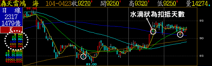 K線乃是開盤、最高、最低、收盤的數據,所繪製的線圖,並且可搭配移動平均線使用,轟天雷最多可設定六條均線,以5MA、22MA、65MA、130MA、260MA、432MA為內定值。 |