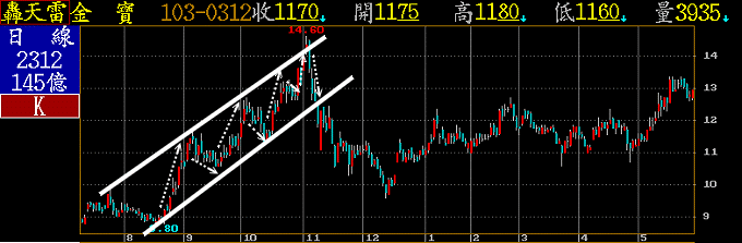 軌道線也就是預測股價趨勢離不開所設定的上下幅度範圍,所以軌道線也可以用簡單的兩條平行線,作為股價起伏的區塊,那麼這就形成了「趨勢軌道線」。 |