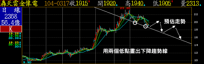 當兩高兩低畫出的切線,看起來像是等比例的平行軌道,這表示未來趨勢較易在這個軌道中上下起伏,聰明的投資人可在這個軌道中來回操作,直到脫離軌道後,才轉成下降趨勢。 |