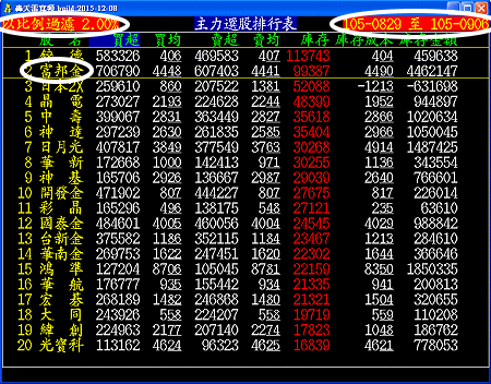 下圖以比例 2%過濾,從圖中很清楚得知,主力進出排行的順序,掌握了這項數據,就可輕鬆搭上主力進出的列車。從下圖游標( 黃底線 ),可以直接移動到您要的股票,以富邦金為例按下Enter更可以進一步知道,有哪些券商,主力在買超富邦金,可用差額進行排序。可能很多人不明白,散戶的作法是從股票裡面找股票,但是更高竿的選股是從券商裡面找股票。 |