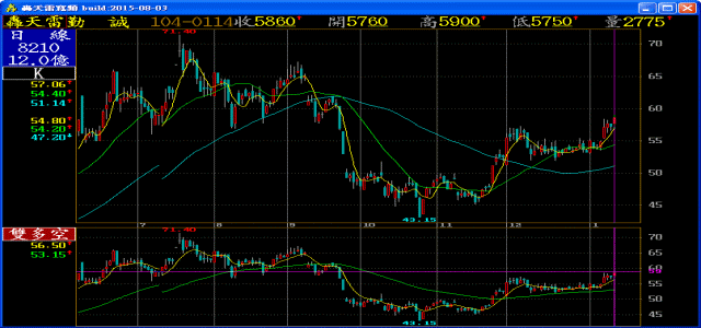 三陽線:股價行進間有如波浪起伏,外加每日盤勢震盪,傳統K線雖然可以表達上下震盪狀態,但是經常無法說明主要趨勢力道,讓投資人陷入「見樹不見林」的窘境。為了解決主要方向問題,利用強勢股必須先過三日高之股價特性,特別設計三陽線指標。 |